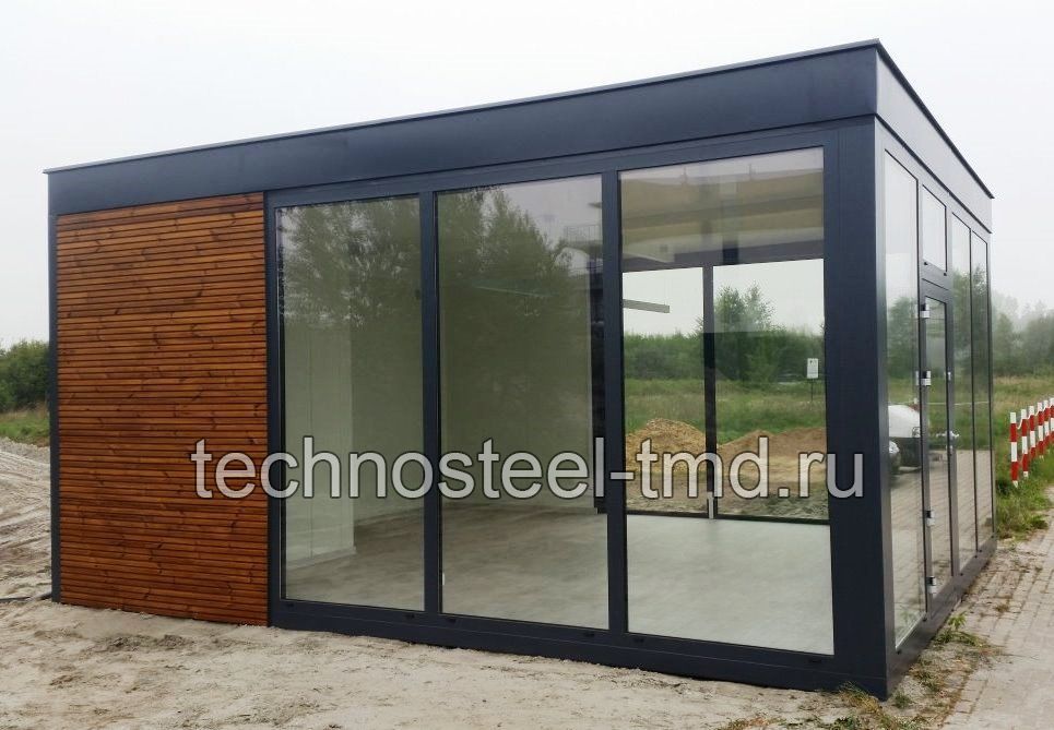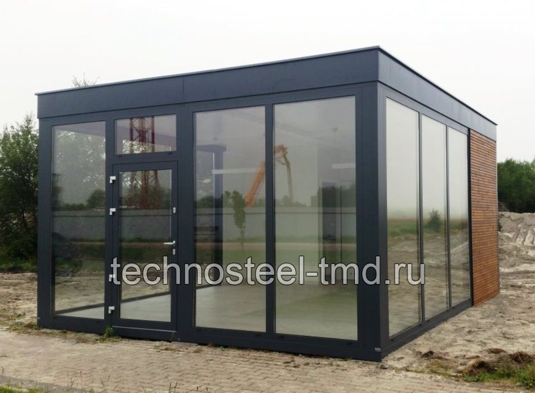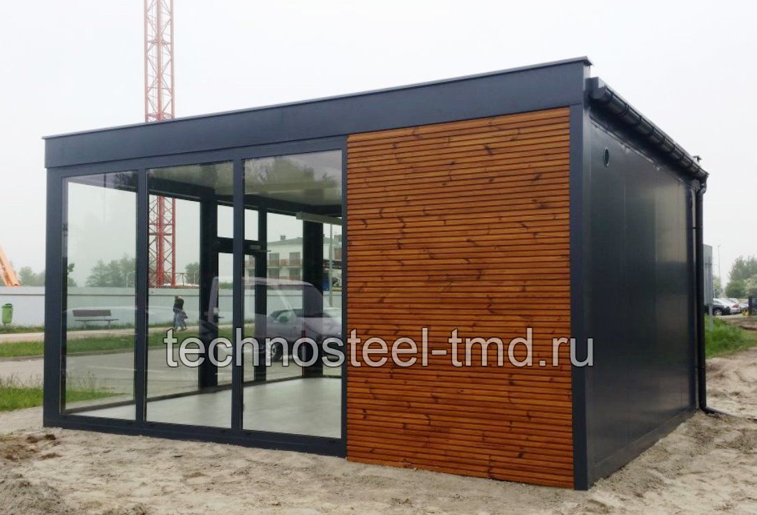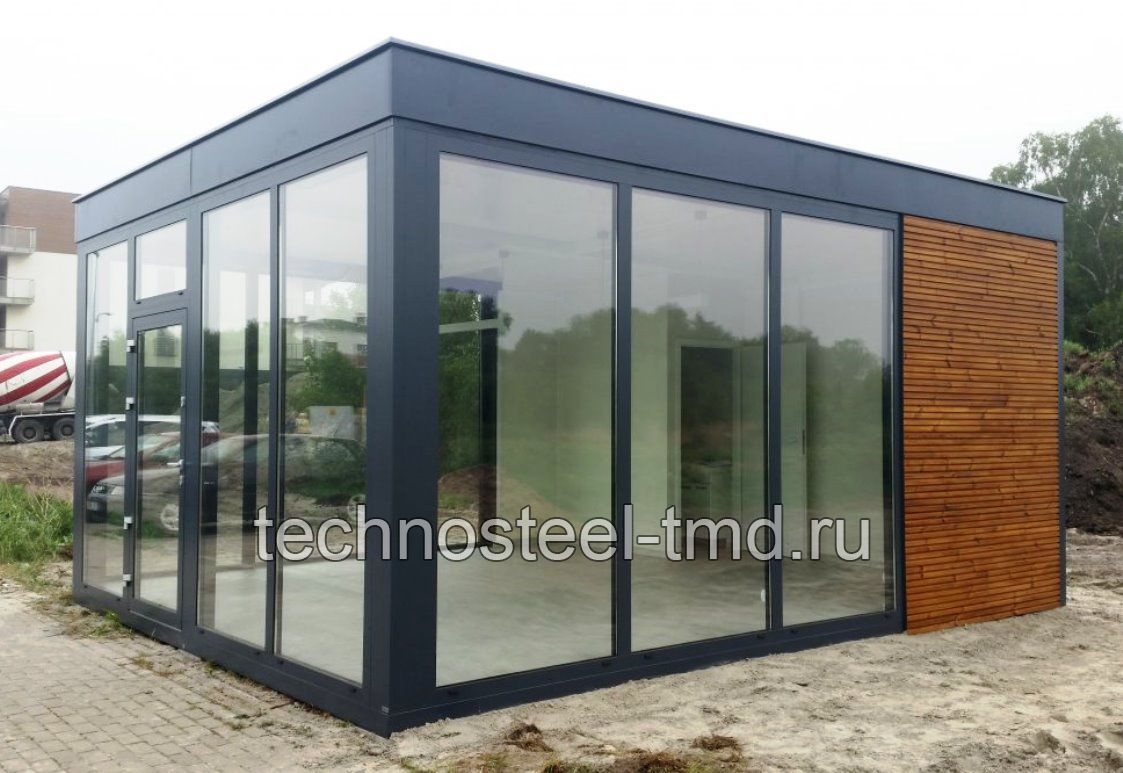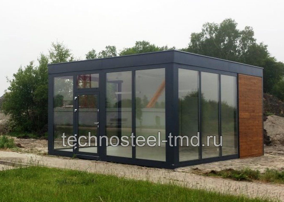 Описание: Павильон "Санрайз А200-6.01/5.0.СП" для офиса, магазина, кафе, бистро, салона, выставки, презентации, медицинского пункта, социального учреждения, современного жилого дома. Павильон представляет собой современного вида быстровозводимое тёплое блочно-модульное здание с панорамным остеклением фасадов с трёх сторон, с входной стеклянной дверью главного фасад, с современными привлекательными архитектурными решениями фасадов. Изготавливается полностью в заводских условиях и поставляется на место монтажа двумя блоками (блок-модулями). Эксплуатируется круглогодично при температуре окружающей среды от +35 до -40 с применением нагревательных приборов.